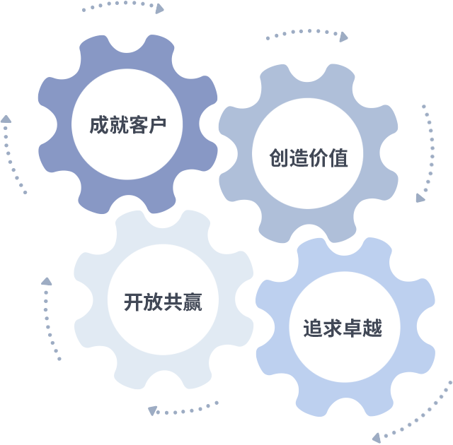 成就客户是一切决策的出发点,创造价值是衡量所有工作的标准,追求卓越是完美365WM做事做人的态度,开放共赢是完美365WM的格局也是最终的结果。价值观的齿轮环环相扣,推动着组织里的每个人不断向前。